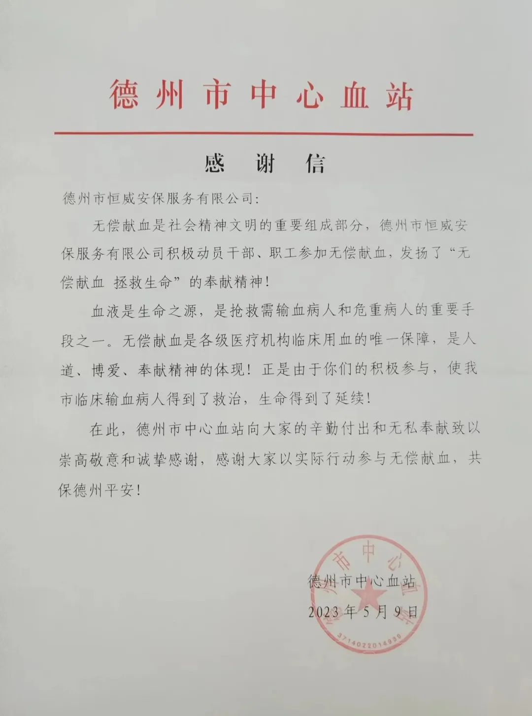 5月9日,德州市恒威安保服務(wù)有限公司組織開展“獻出一份血,傳遞一份愛”無償獻血活動,以實際行動支持無償獻血活動。