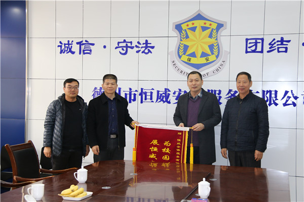 2018年11月30日上午, 德州學(xué)院保衛(wèi)處處長王榮朝、副處長李巖、治安科長王鳳丹來我公司調(diào)研慰問并贈送繡有“為校園保駕護航、展恒威安保風(fēng)采”錦旗一面。