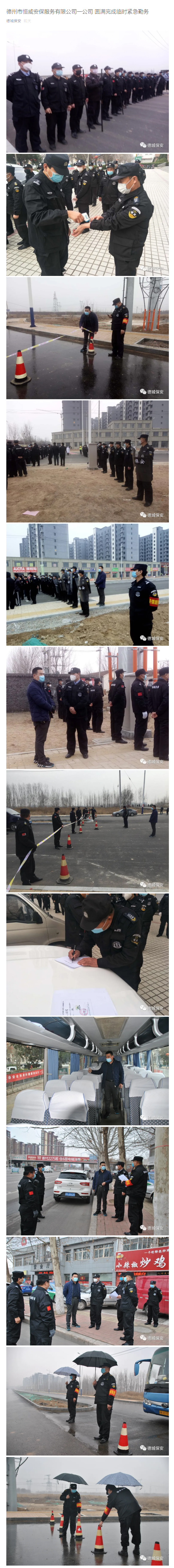 早7時30分,一公司50人的應(yīng)急勤務(wù)隊伍迅速在區(qū)委西德州銀行快速集結(jié)到位。,參加勤務(wù)人員認(rèn)真仔細(xì)進(jìn)行了體溫檢測、填寫健康登記表。公司副總經(jīng)理、一公司經(jīng)理王洪林親自對人員運送車輛進(jìn)行了噴灑消毒。8時許,到達(dá)勤務(wù)現(xiàn)場,按照勤務(wù)預(yù)案,布控組、巡邏組、應(yīng)急組、保障人員迅速就位,布置警戒線、隔離墩。期間,按照要求成功處置一起突發(fā)事件,保障了施工單位正常施工作業(yè)。